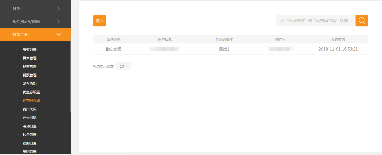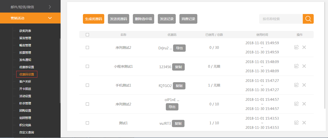在建站后台-“营销活动”-“优惠码设置”中,可以对优惠码进行浏览、复制、导出等操作,如图所示: